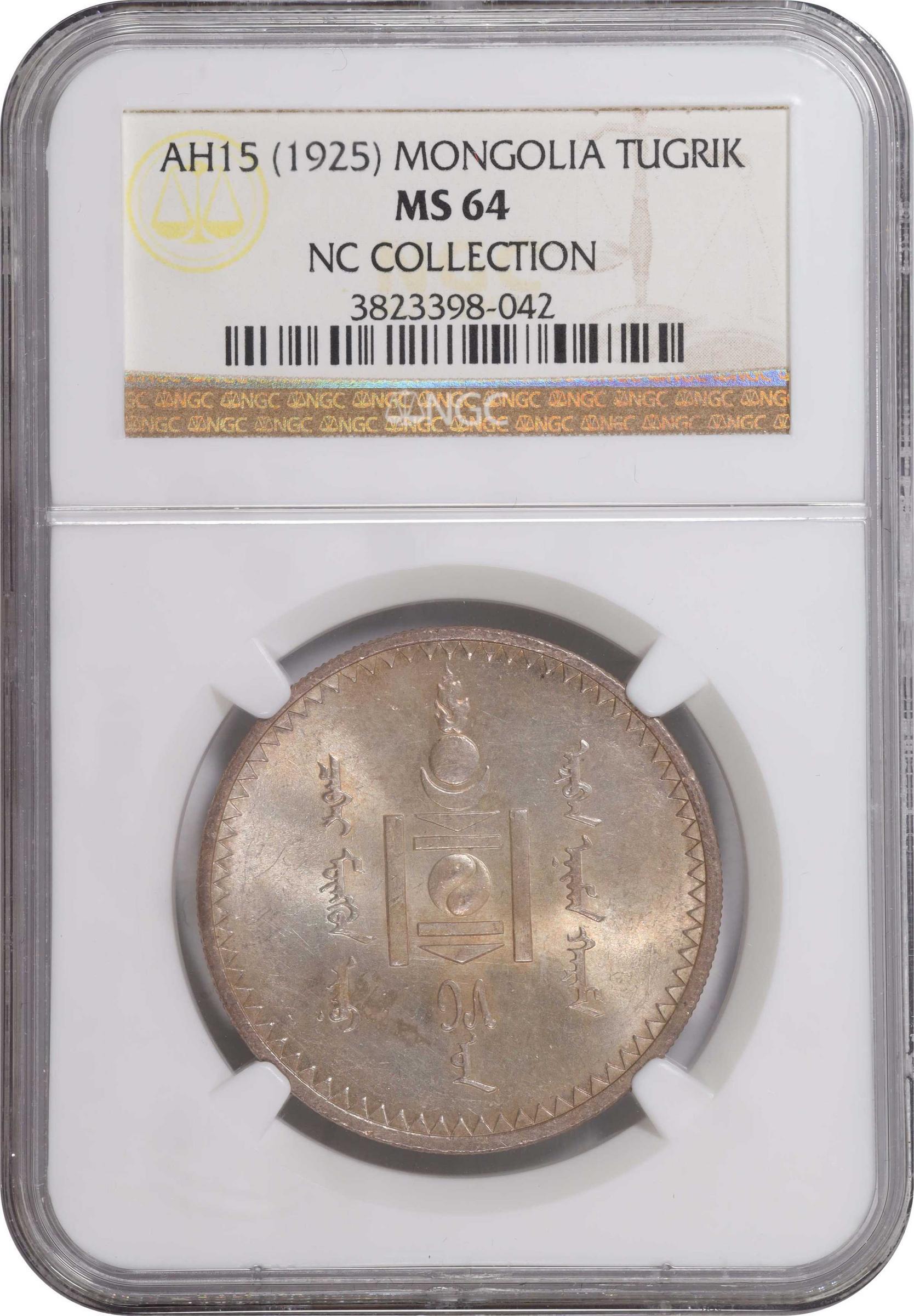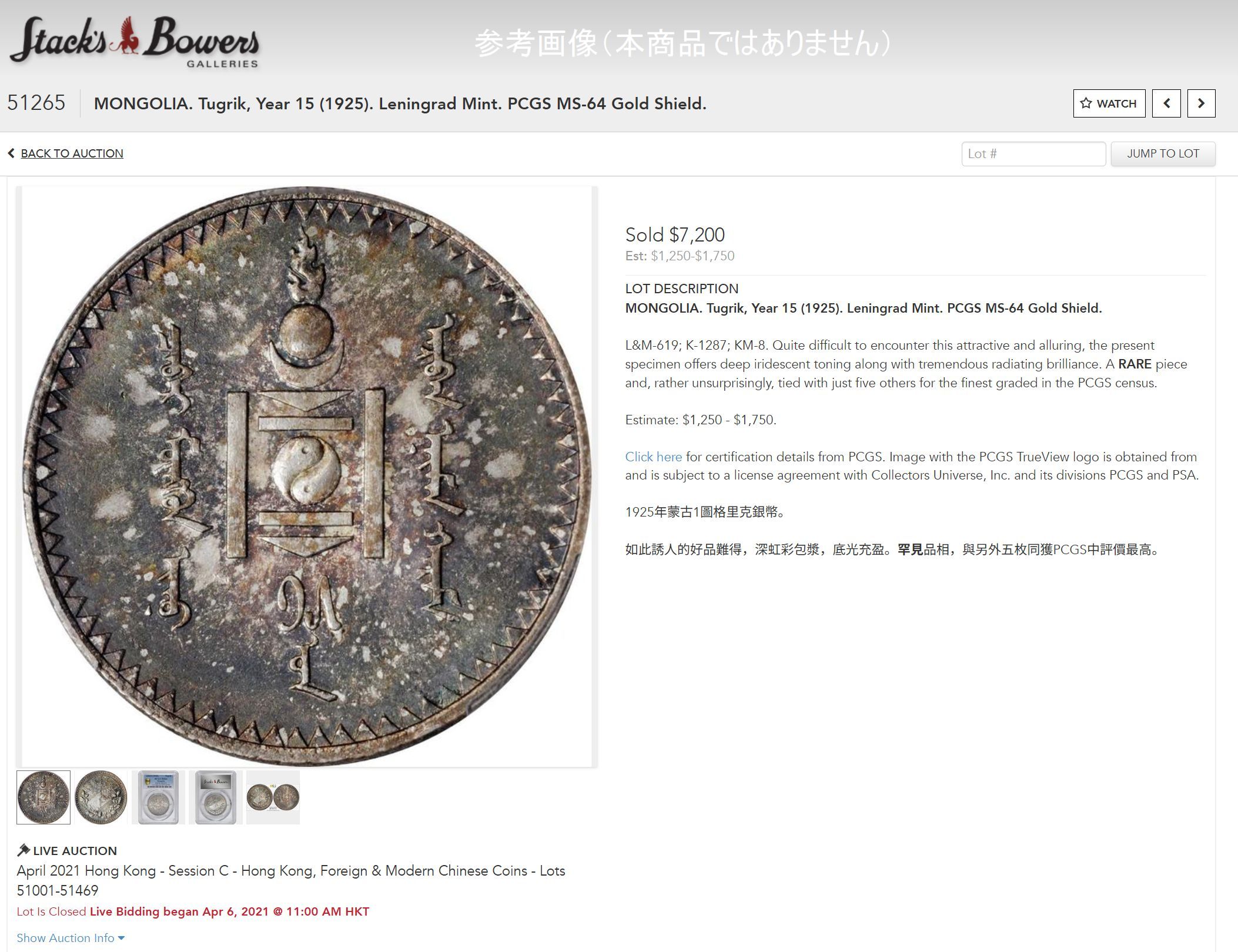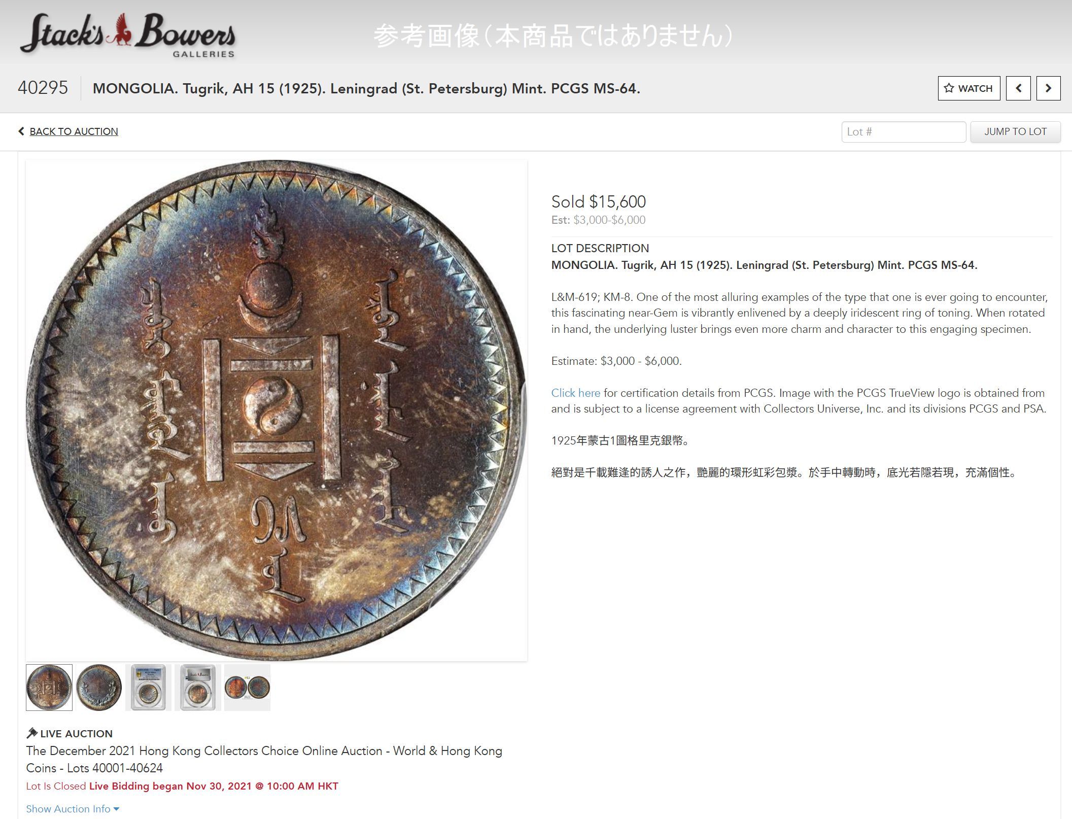 【準最高鑑定】稀少モンゴル トゥグリク銀貨 Tugrik 1925年 MS64 - 琥珀色・放射状光沢の美トーン!